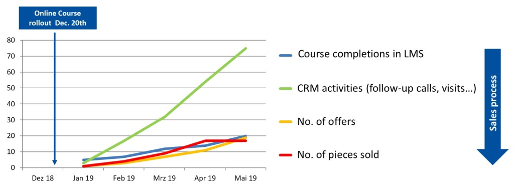 As soon as the first salesmen have completed their online courses they started presenting the product to customers (green line). Some visits were followed by offers/quotations to the customer (yellow line) and the sales team was also able to convert offers into orders (red line).